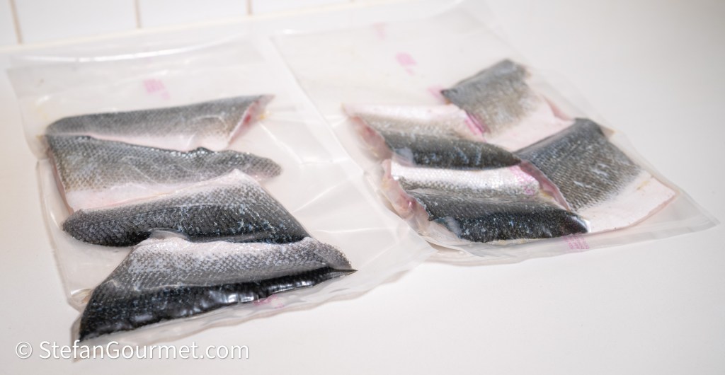 Season the sea bass with salt and freshly ground white pepper on the flesh side, then vacuum seal in a single layer. Divide the fillets into two if you are making 8 small portions. Allow the salt to penetrate into the fish for at least an hour in the refrigerator.