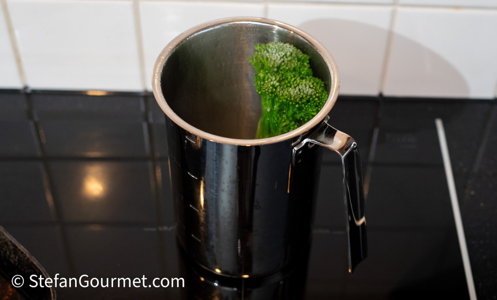 Steam the broccolini for 2 minutes. This is easiest in a pot in which they fit snugly, in which you put the broccolini with the stems down in about 2.5 centimeters (1 inch) of boiling water.