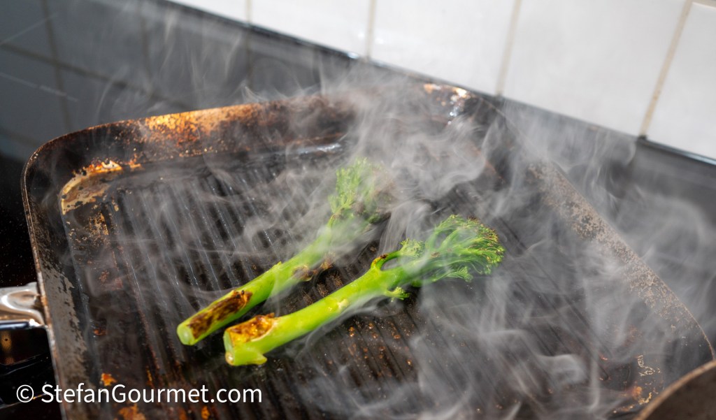 Rub a griddle pan with vegetable oil and heat it up until very hot. Grill the broccolini over high heat until you see grill marks on both sides. Keep the broccolini hot in the oven at about 100C/200F.