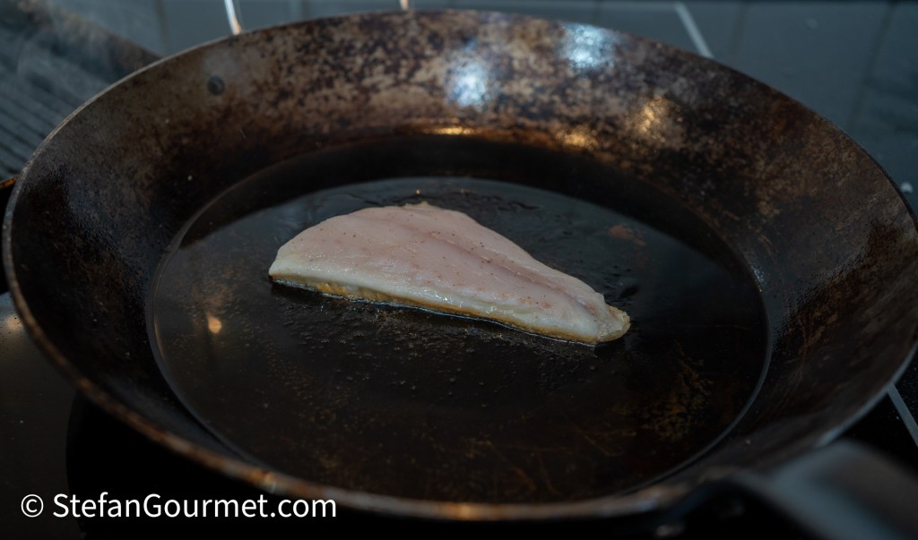 When the sea bass has been cooked sous vide, take it out of the bag, and dust the skin side with flour. Heat clarified butter in a frying pan, and fry the sea bass on the skin side only over high heat (but not too high) until the skin is brown (not burnt) and crispy, 1 to 2 minutes. The flesh side should remain medium rare.
