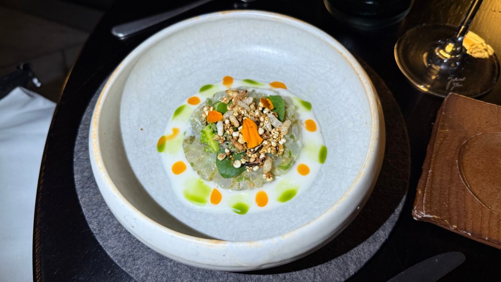 This was a good pairing for the tartare of dhufish with green asparagus, sunrise lime, mustard seeds, and a fish skin granola. This dish was very elegant and mostly about the play on textures.