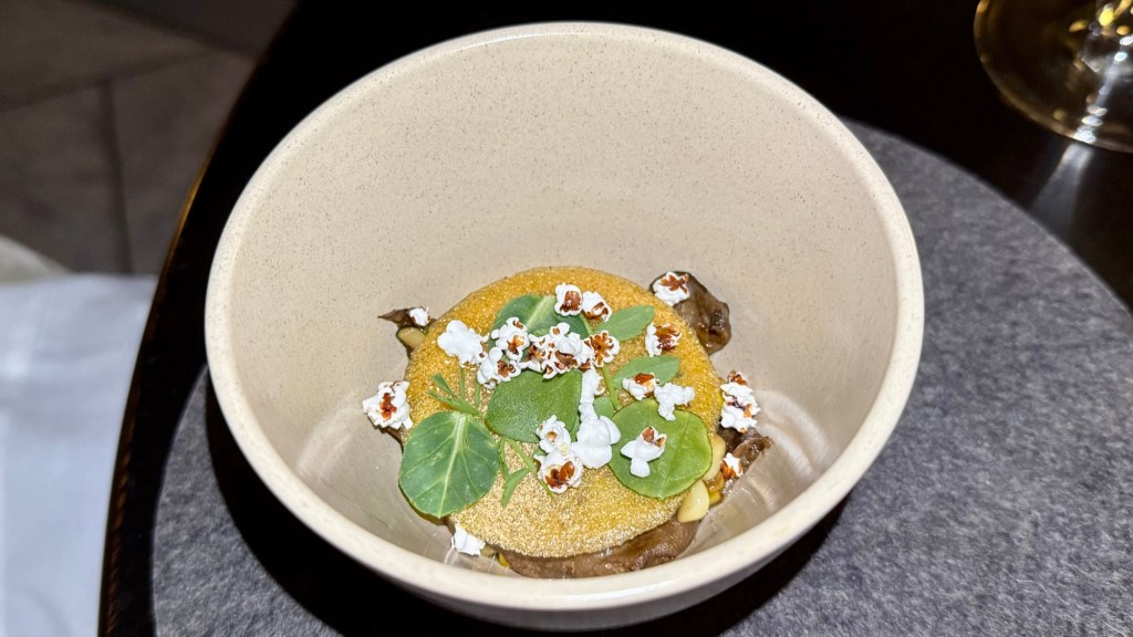 This was a very good pairing for the kardinya mushrooms with puffed sweetcorn, sandalwood nut, and black garlic. Another very elegant dish with a nice mushroom flavor.