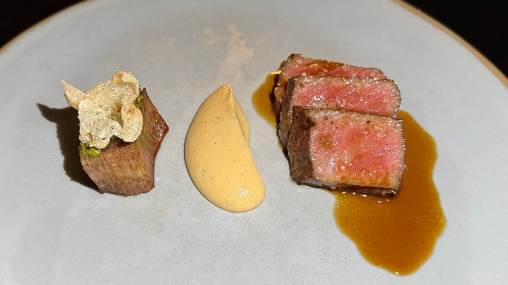 Laminated ox tongue means sliced thinly, brushed with something (I think they said it was miso but I didn’t taste it and therefore did not mention it) and then the sliced stacked in the original shape. Potatoes are called hasselback when prepared in a similar fashion.