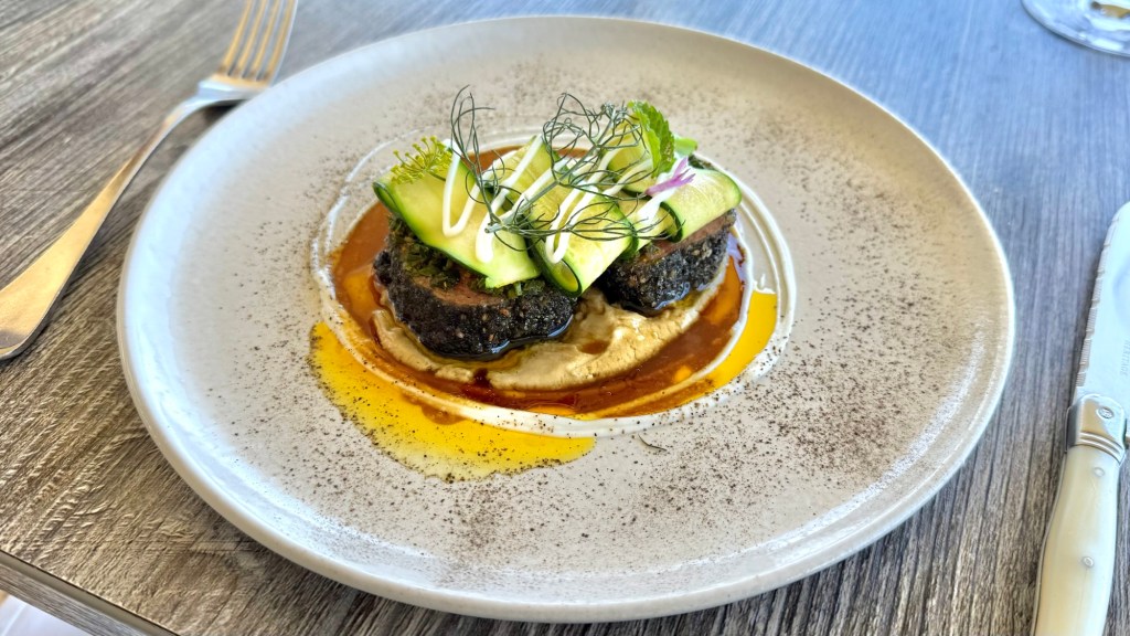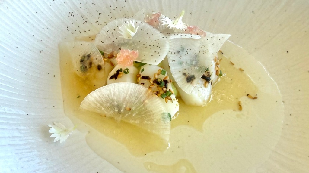 This was an excellent pairing for an outstanding dish: Shark Bay scallops, cured and lightly steamed, with avocado cream, thinly shaved daikon, a bit of wasabi, and a rice tosazu sauce. This dish was amazing, worthy of several Michelin stars. Great elegance, balance, and complexity. The scallops had great texture, almost raw but slightly more firm but very tender and juicy at the same time. There was a smoky element as well. The daikon provided some very gentle crunch. There was just a hint of wasabi. And the wine, which was good by itself, became much better with the dish. Wow.