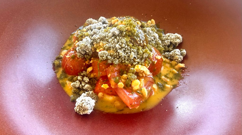 It was a good pairing for the Margaret River heirloom tomatoes with stracciatella cheese, yellow chili, and frozen green tomato nectar. Because of the frozen nectar the tomatoes were served quite cold, so they were not as flavorful. The chilli brought some nice spiciness that was enhanced a bit by the acidity of the wine. Altogether a very nice dish and pairing.