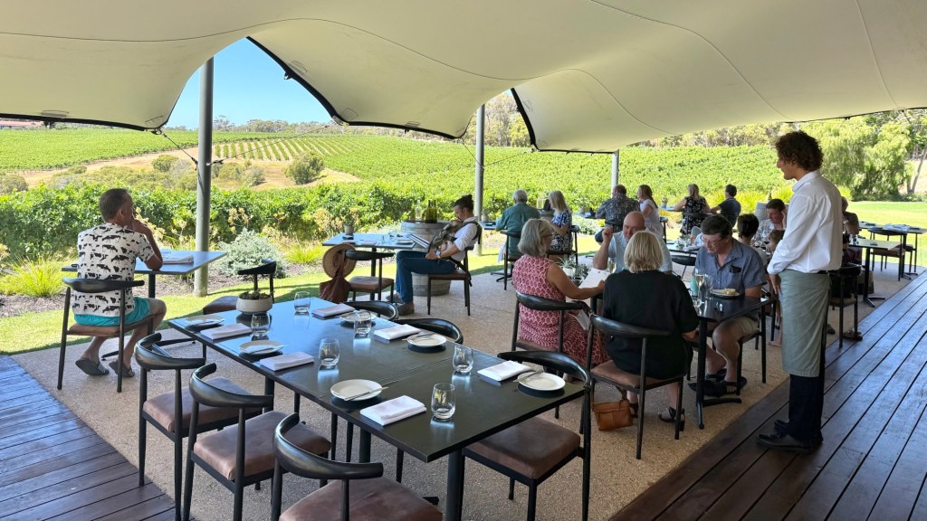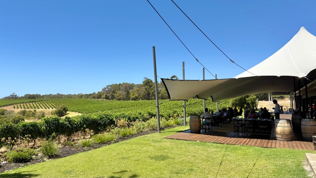 Our first fine dining experience at a Margaret River winery sets a high standard for the other lunches to follow! Food and wine pairings were excellent, the service very friendly. As we have noticed before, a lot of the serving staff in Australia is ‘imported’ from Italy or France, and this was no exception. The only criticism I could provide is that the irregular pace of the menu; the scallops and Sauvignon arrived too quickly after the sparkling, while later on it slowed down too much, and the coffee arrived well before the dessert.