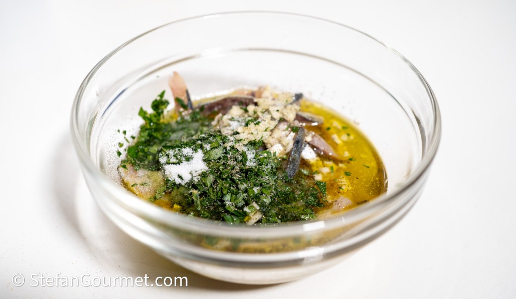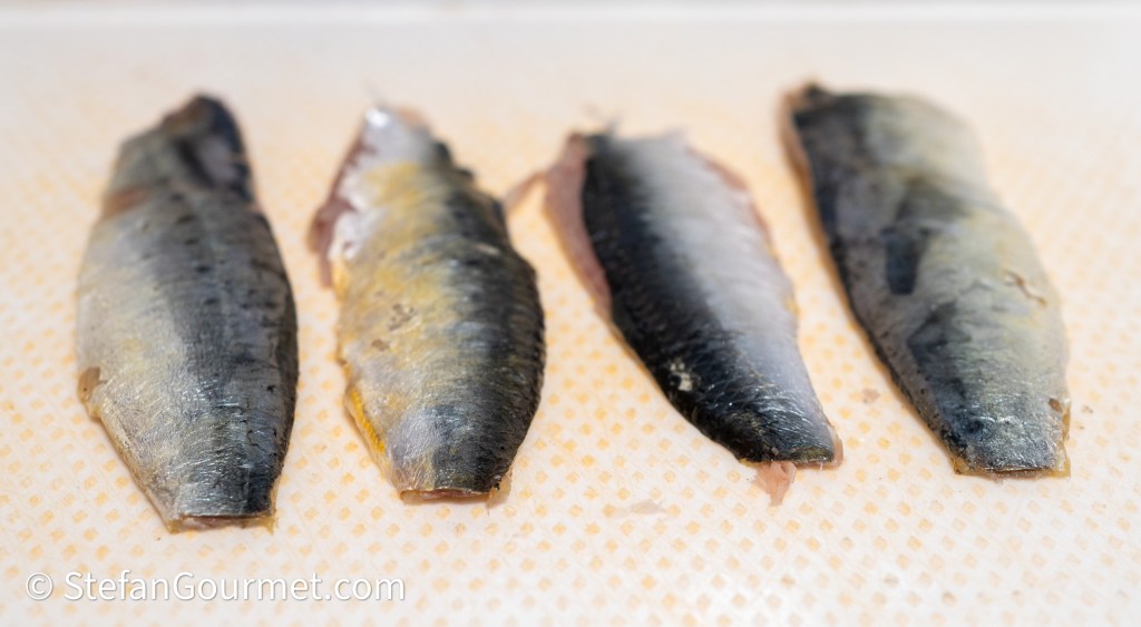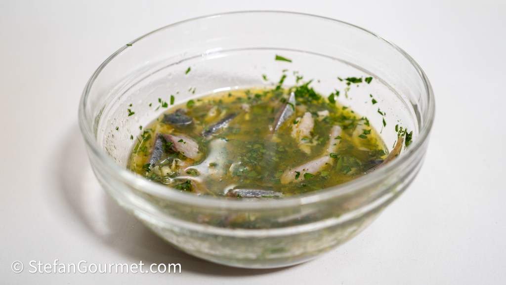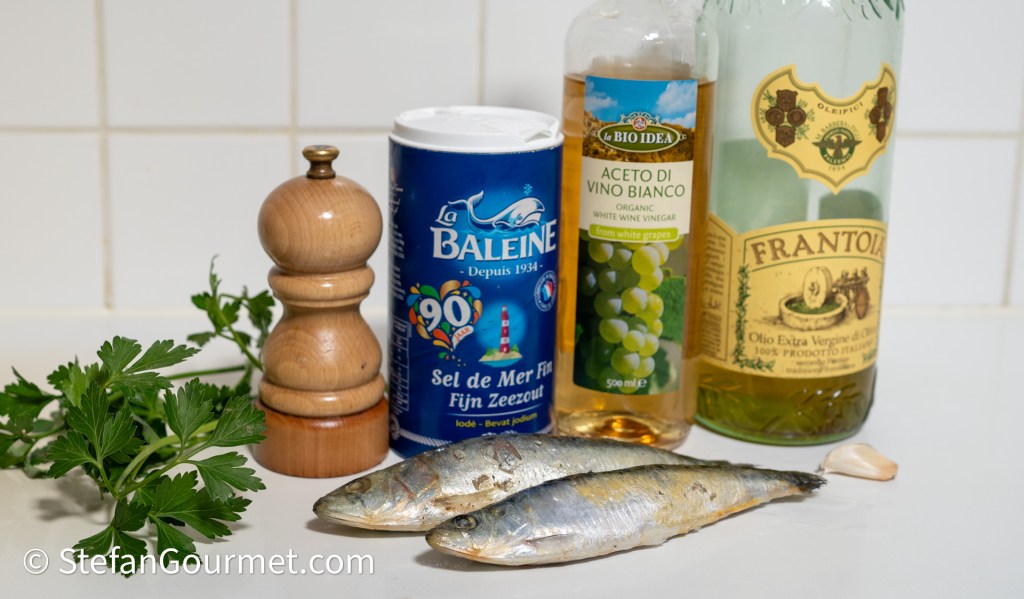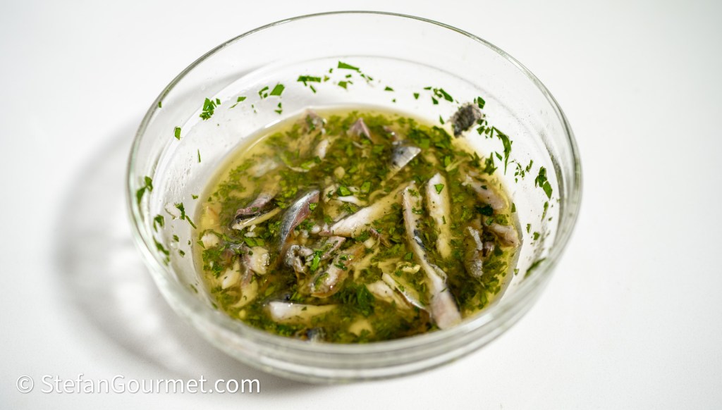 Boquerones en vinagre is a Spanish recipe for fresh anchovies marinated in vinegar, olive oil, parsley, and garlic. It is often served as tapas in Spain. A very similar preparation is the Italian alici marinate, with the main difference that Italians often add fresh lemon juice to the marinade. The problem with making this recipe is that you need fresh anchovies for this, whereas anchovies in many places in the world are only available already salted/cured or marinated. Another issue is that if you can find anchovies, it is a lot of work to clean them. I found a solution for that: sardines have a very similar flavor, and frozen sardines are readily available. Cleaning sardines is still a bit of a chore, but as the fish are bigger it is much less work. If you slice the sardines into strips of the size of anchovies, it is hard to tell the difference. And if fresh anchovies are not available at all, this may be your only option.