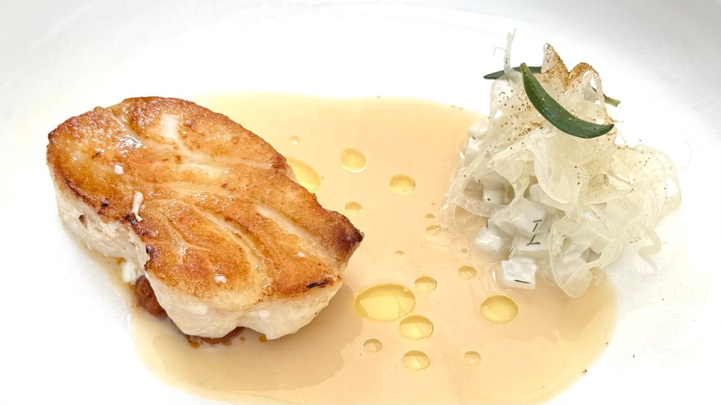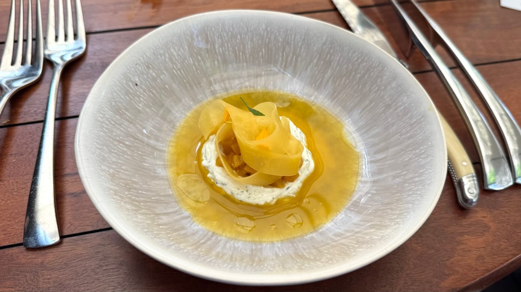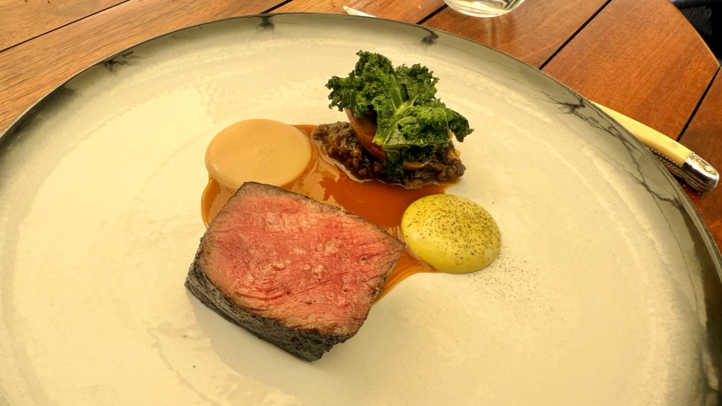 It was a good pairing for the yellow beetroot with fromage blanc, and desert lime. The wine improved with the dish. I think a goat’s cheese would have been even better.