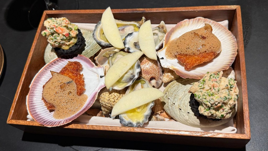 The second set of snacks consisted of an oyster with olive oil and apple, a deep fried scallop with black garlic foam, and a prawn salad on charcoal brioche with sweetcorn puree. I especially liked the prawn salad.