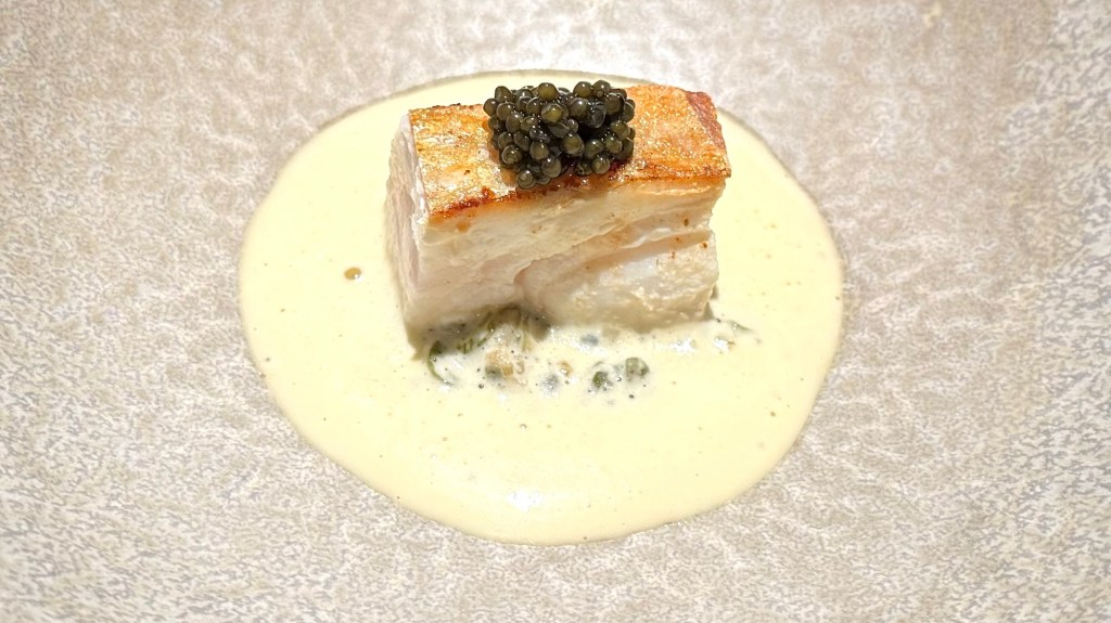 This was a good pairing for the dhufish with a butter sauce flavored with highly concentred stock of fish bones, with young scallions, and some caviar on top. The young scallions from the restaurant’s garden were nicely sweet and a nice contrast with the caviar. The fish could have been cooked slightly less, but otherwise a very nice dish.