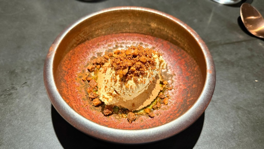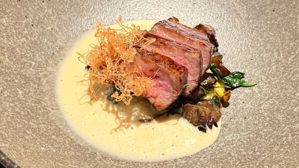 It was a good pairing for the Margaret Rivery wagyu beef with potato puree, corn, and spinach. The beef had been glazed with a tare (Japanese glaze) made by the restaurant from abalone. When eating everything together, the beef was drowned out a bit by the other stuff on the plate. But itself, the flavor of the beef with the glaze was very nice and by alternating bites the dish ‘worked’ very well. The wagyu was not as tender as other wagyu beef we’ve had in this area.