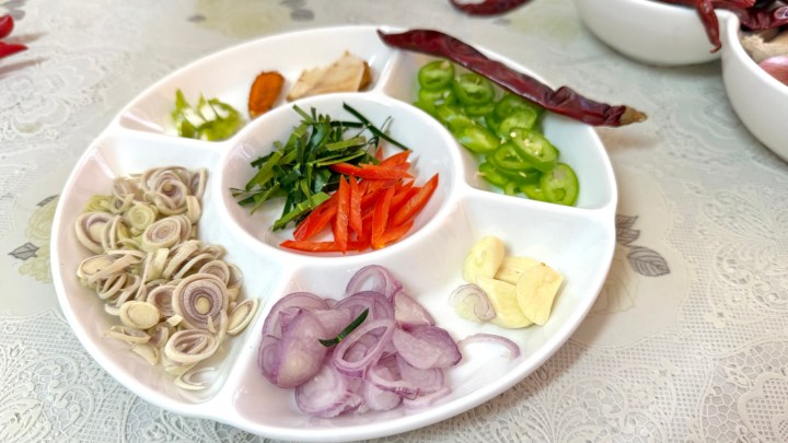 Most cuisines have a ‘holy trinity’. For Thai cooking it is chillies, garlic, and shallots. (For Italian it is onion, carrot, and celery.) The flavor profile of most dishes starts with the trinity and builds from there. Pea explained that home versions of Thai dishes often have less ingredients than restaurant versions, because people use what they have. And so ingredients like shrimp paste or coriander root can be omitted or substituted (e.g. more fish sauce if you don’t have shrimp paste). (Pea mentioned that she used coriander root mostly as a barbecue marinade for meat, pounded together with garlic and peppercorns.) We were going to make some ‘home cooking’ dishes from the Northern Thai cuisine.