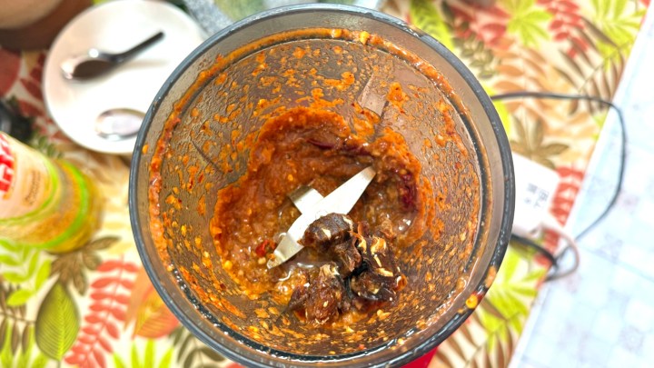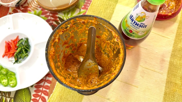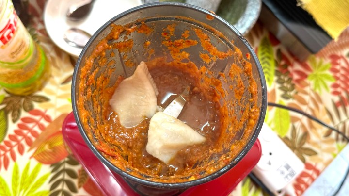 The next dish we were making was Gaeng Som, a sour fish soup that I had made before with shrimp. We started by blending the usual trinity of chili (in part as ground chili), shallots, and garlic.