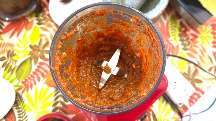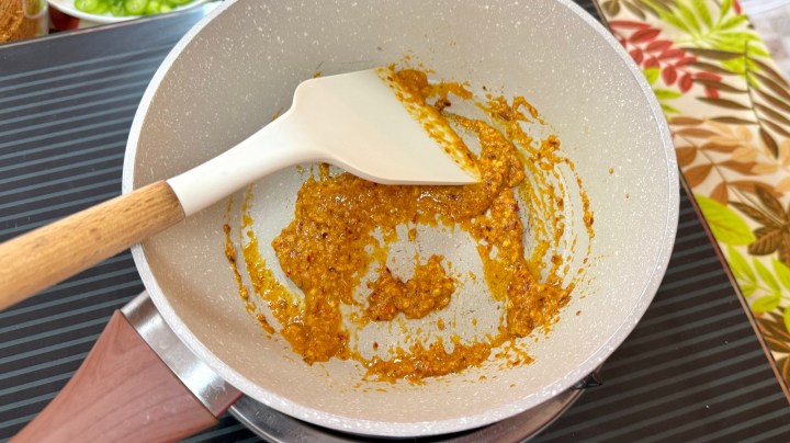 We used some cooking oil or coconut oil to get the blender going to make the paste. This meant that instead of using the coconut cream that floats on top of coconut milk, we could fry the curry paste in a dry pan (as it already contains oil). This makes the curry more creamy, because in the final dish we will have both the oil and the coconut cream. Pea said the color of the curry paste would have been more red if we had soaked the dried red chillies for a longer time.