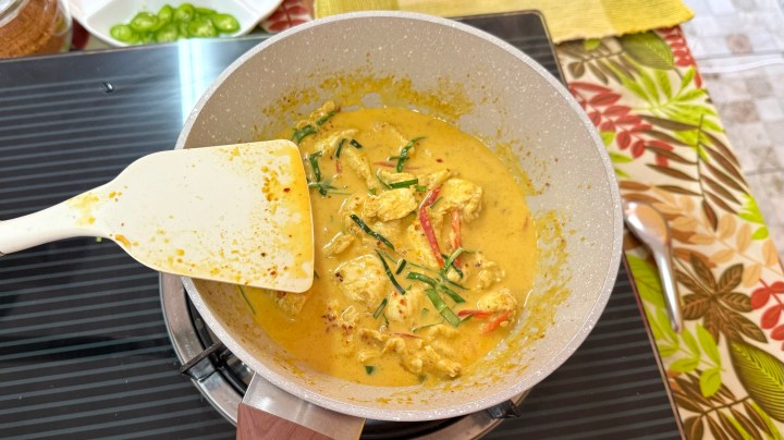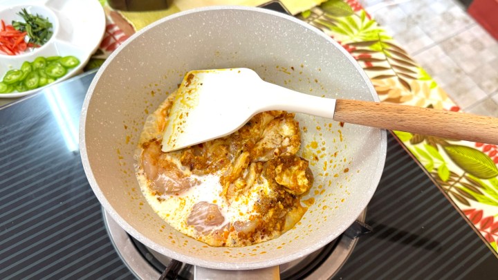 The chicken was added, along with a bit of coconut milk. Pea added the coconut milk gradually. It was chicken breast, so it cooked very quickly. We tasted it again and added some more cumin and coriander and seasoned the curry with palm sugar and fish sauce. (Lime juice is not used in Panang curry.)
