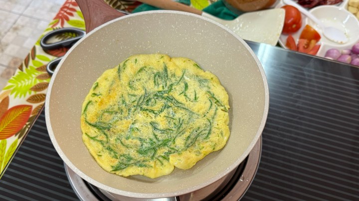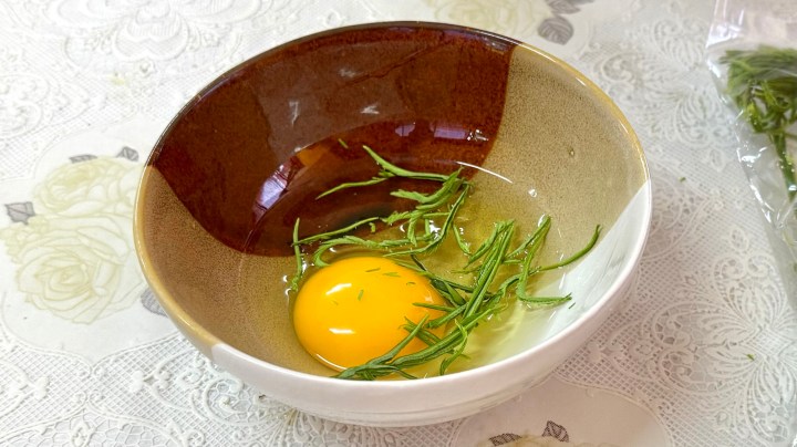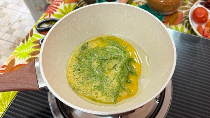 In the meantime, Pea was making an omelette by mixing an egg with the green feathery herbs and a splash of fish sauce.