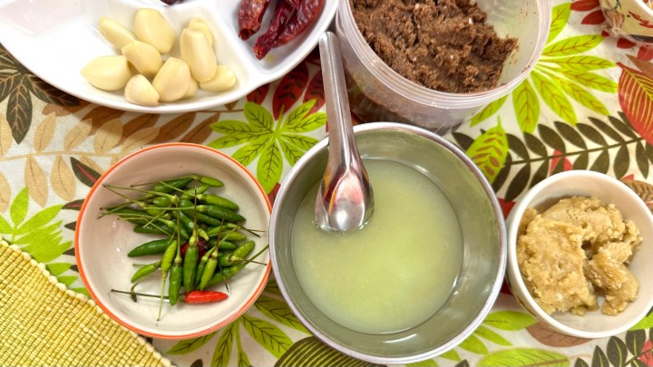 Nam prik kapi is a dip of fermented shrimp paste, sweet shrimp paste, fresh chilies, lime juice, palm sugar, fish sauce, and garlic.