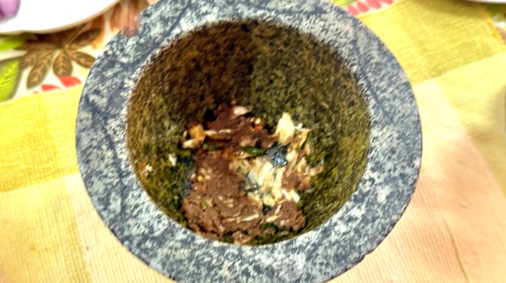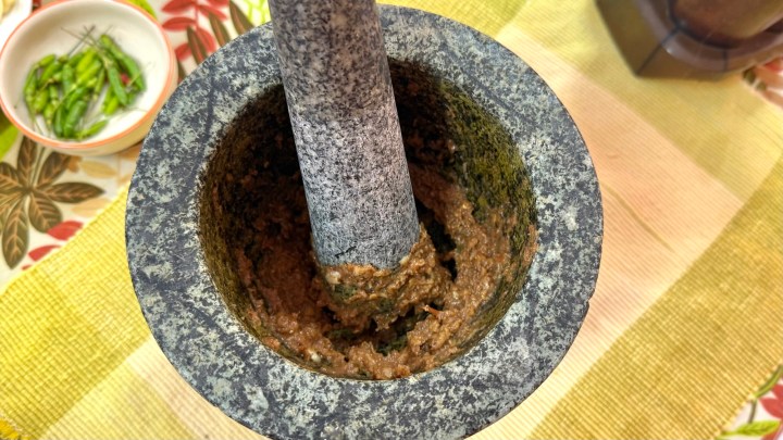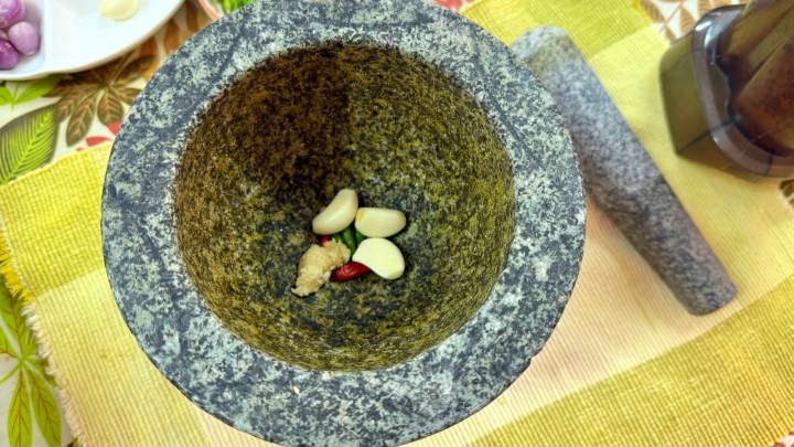 We started by pounding garlic with chilies and palm sugar.