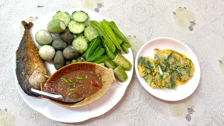 The nam prik kapi was served with fried fish, the omelette, steamed eggplant, beans, and bitter melon, and raw cucumber, eggplant, and beans.