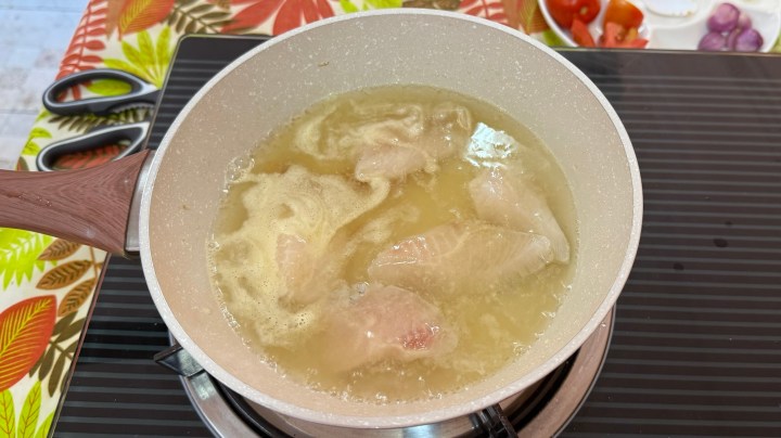 The fish (tilapia) was poached in water with salt and a bouillon cube. (When I made Kaeng Som myself, I used fish heads and bones to make the stock.)
