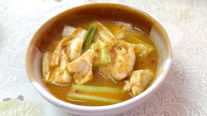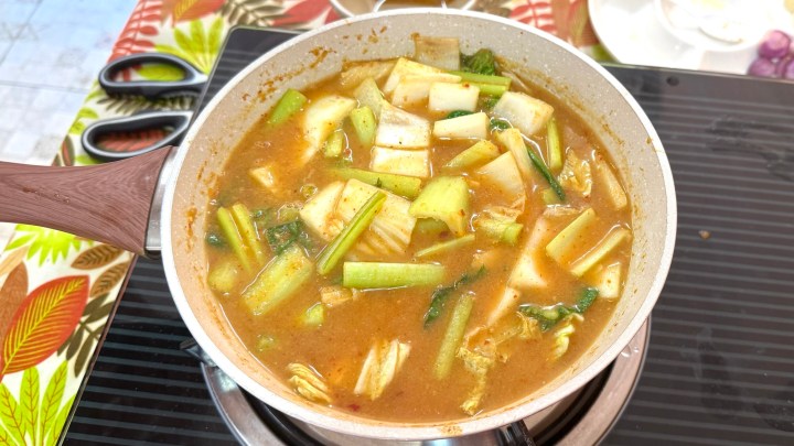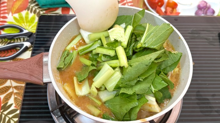 The vegetables were boiled only briefly, to keep them crunchy. (Note that I would usually separate the green leaves from the bok choy and add them later, and allow the fish to poach in the hot soup without boiling it.) Because the vegetables release water, the soup had to be tasted to adjust the seasoning. It needed some more fish sauce.