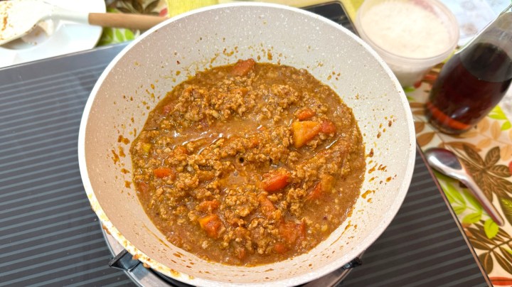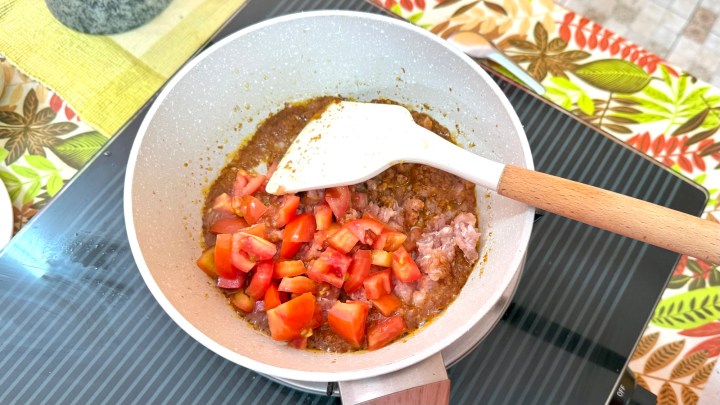When the pork was almost cooked through and broken up, diced tomato was added. It is important to use sour tomato for this, to get enough of a sour note in the dip.