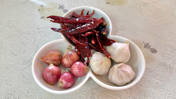 The final thing we made was Nam prik ong, a pork and tomato chili dip. You can guess that we started again with the holy trinity of (dried red) chili, garlic, and shallots.
