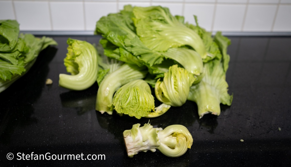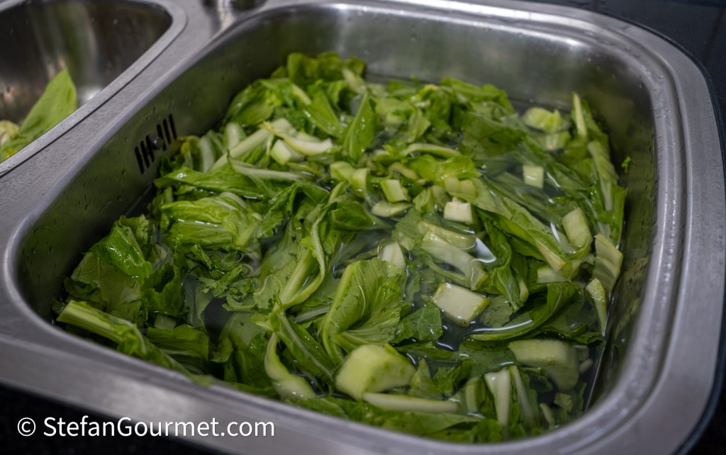 Separate the leaves into the tough stems (white part) and the soft leaves (green part). Chop the stems more finely than the leaves, as the leaves will shrink when you pickle them.