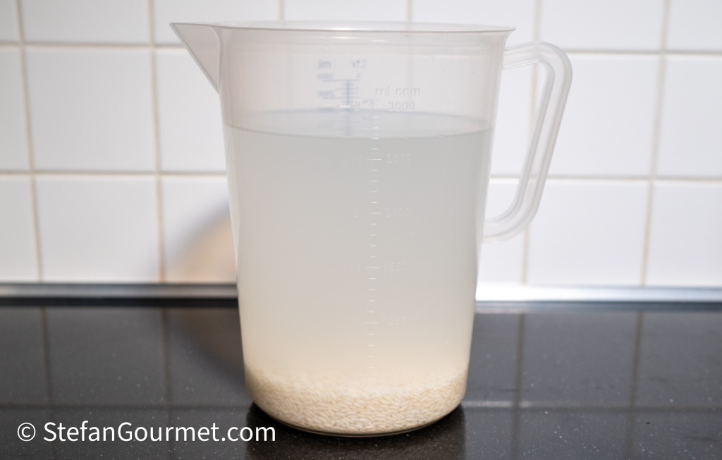 Combine the water with the sticky rice. Soak the rice in the water for at least 15 to 20 minutes.