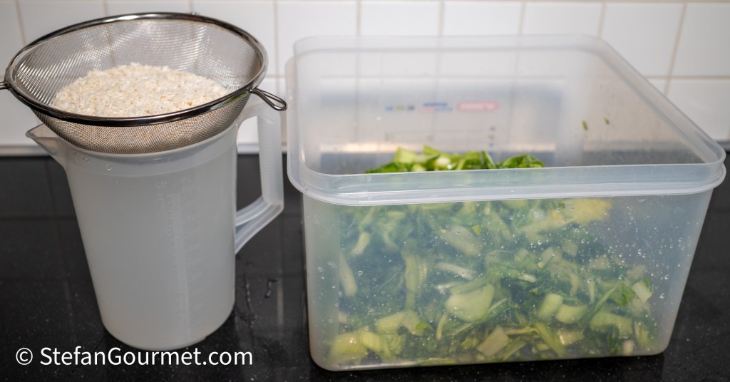 In the meantime, separate the leaves of the mustard greens from the trunk, and discard the trunk. Weigh the leaves and calculate the other ingredients accordingly. I had 1458 grams of leaves, so I calculated 22% * 1458 = 324 grams of sticky rice and vinegar, 17% * 1458 = 247 grams of salt, and 167% * 1458 = 2434 grams (or mls) of water.