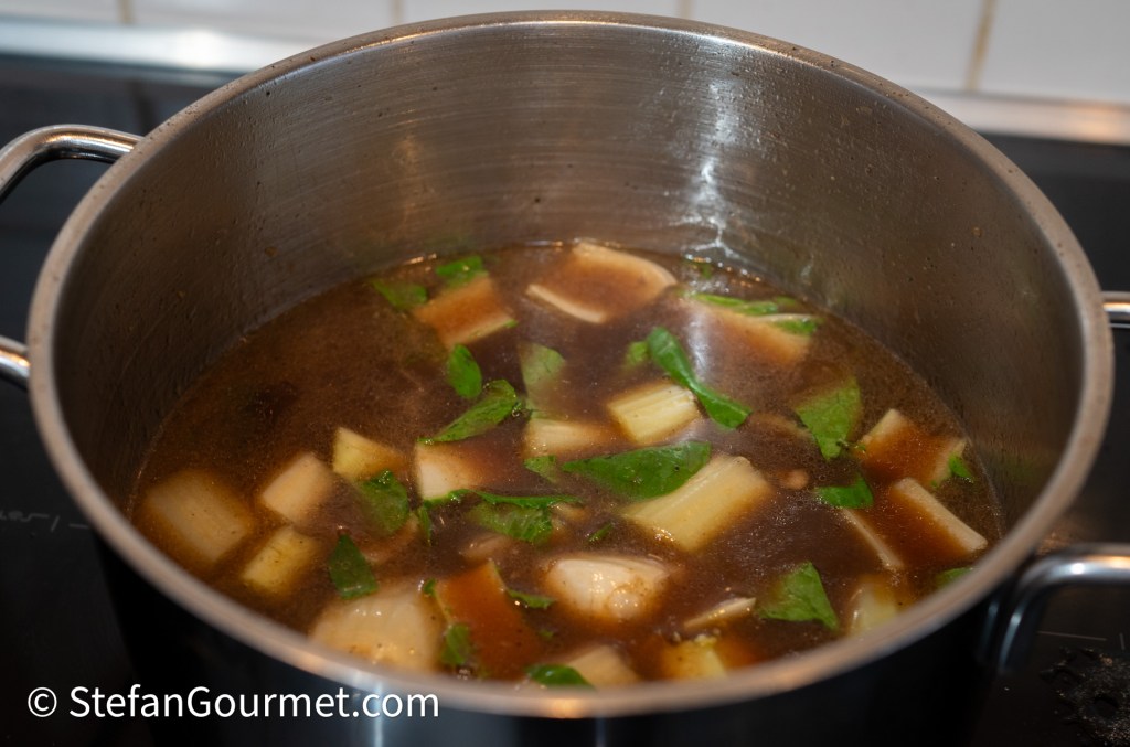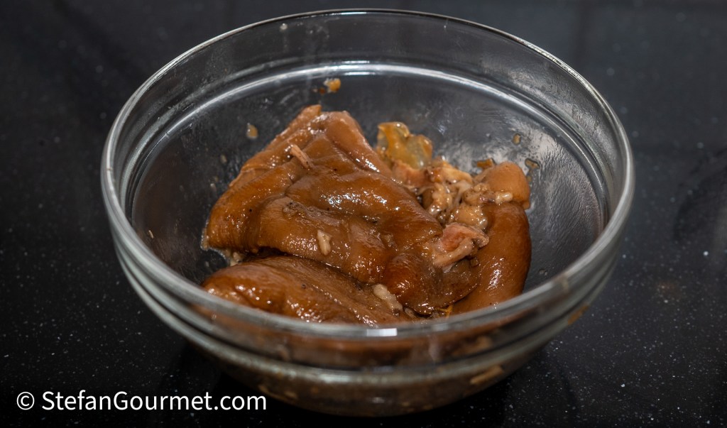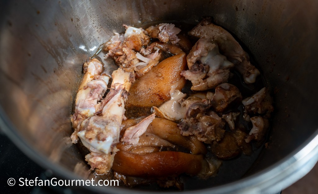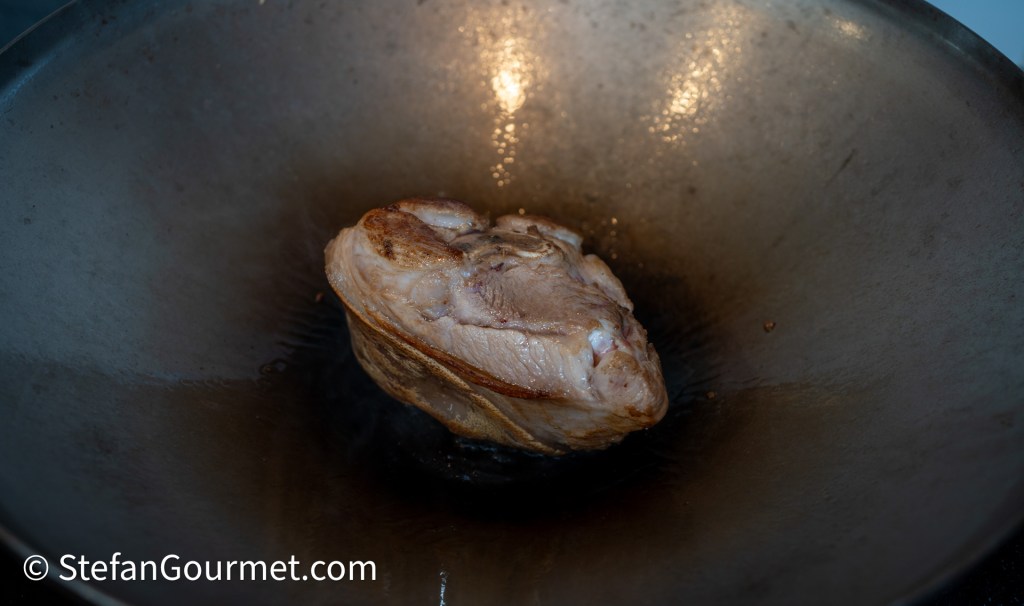 Allow the seared pork hocks to cool off. Do not discard the oil in the wok.