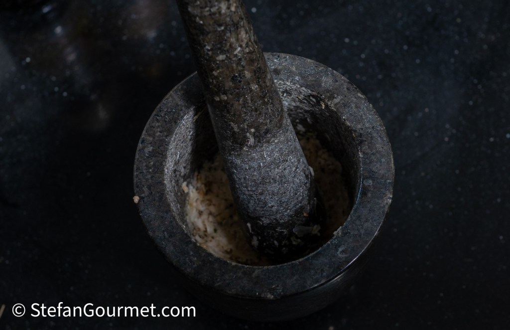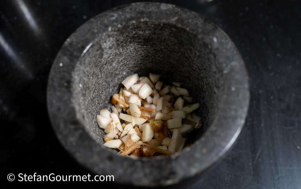 Chop 3 to 4 coriander roots, 2 to 3 garlic cloves, and 5 slices galangal. Put them in a mortar, together with 1/2 tsp white peppercorns.