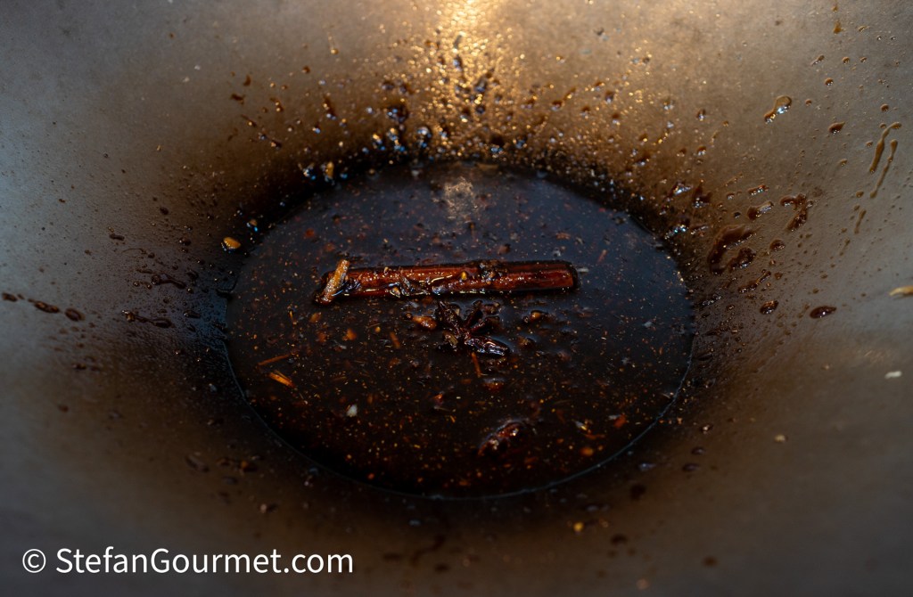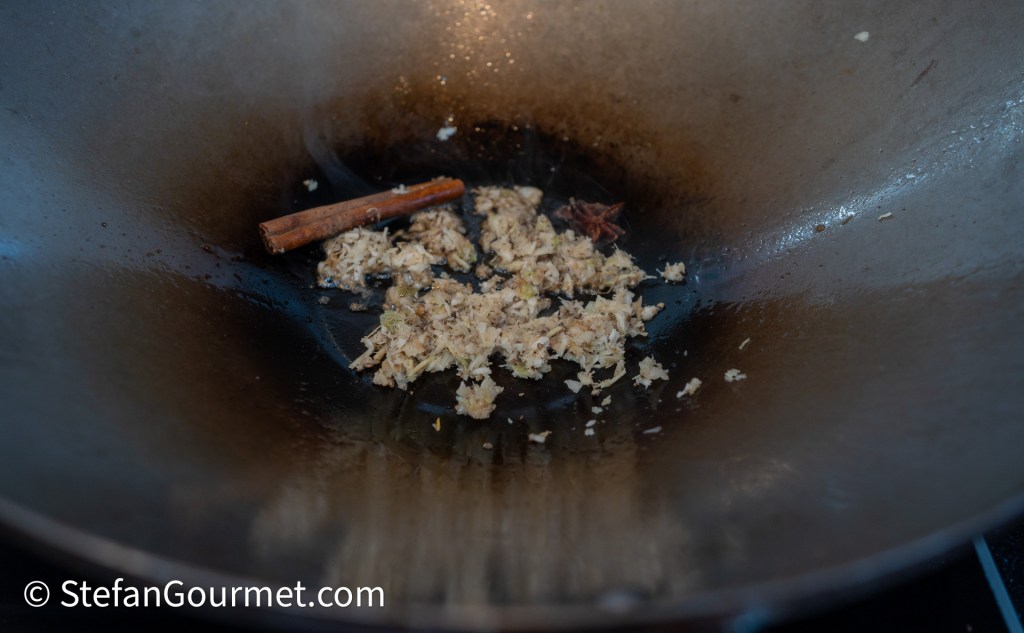 Add the paste to the wok, together with 1 cinnamon stick and 1 star anise. Stir fry for a minute, adding a bit more vegetable oil if needed.