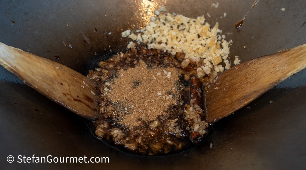Turn off the heat, and add 2 Tbsp light soy sauce, 1 Tbsp dark soy sauce, 2 Tbsp oyster sauce, 1 tsp five spice powder, 1/2 tsp table salt, and the minced palm sugar.