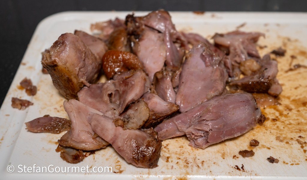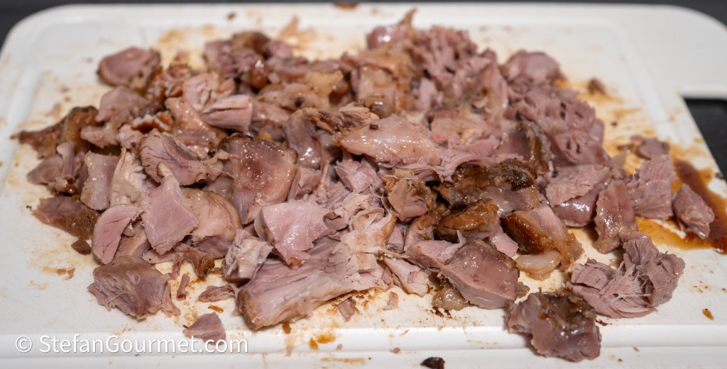 Separate the nice meat from the skin, bones, fat, and anything else that doesn’t look like nice pink meat.