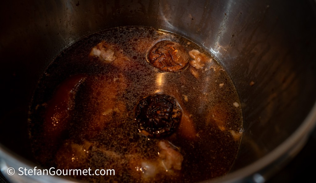 Add 1 litre (4 cups) of water, and 8 dried shii take mushrooms. The water should be enough to barely cover everything. Add a bit more if needed.