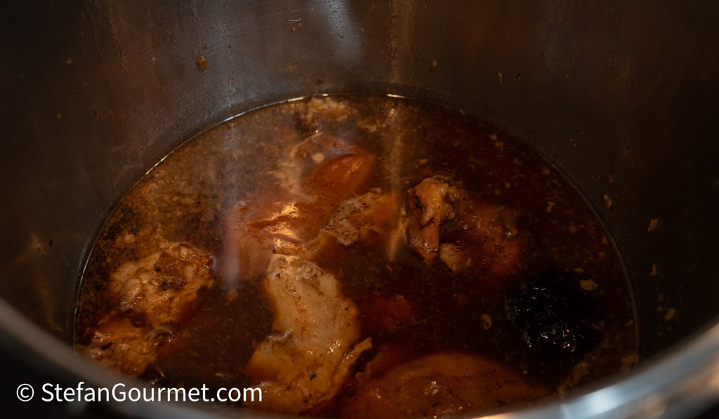 Bring to pressure and pressure cook for 1.5 hours, or cover, bring to a boil, and simmer for 3 hours. This will extrac the flavor and gelatin from the skin, bones, spices, and shii take mushrooms, to get a great gravy.
