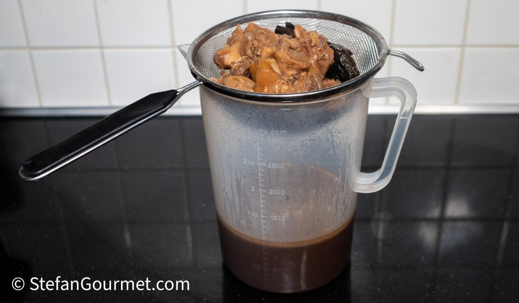 Pour the liquid from the bag (including the cinnamon stick and star anise) into a stockpot or pressure cooker. Then take the meat out of the bag, and allow it to cool a bit so you won’t burn your fingers.