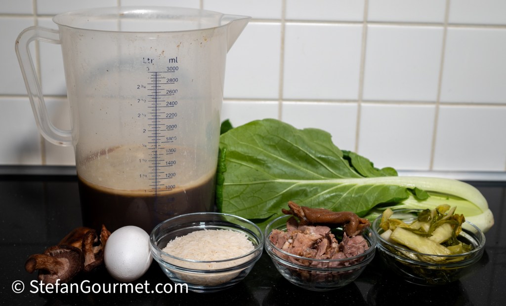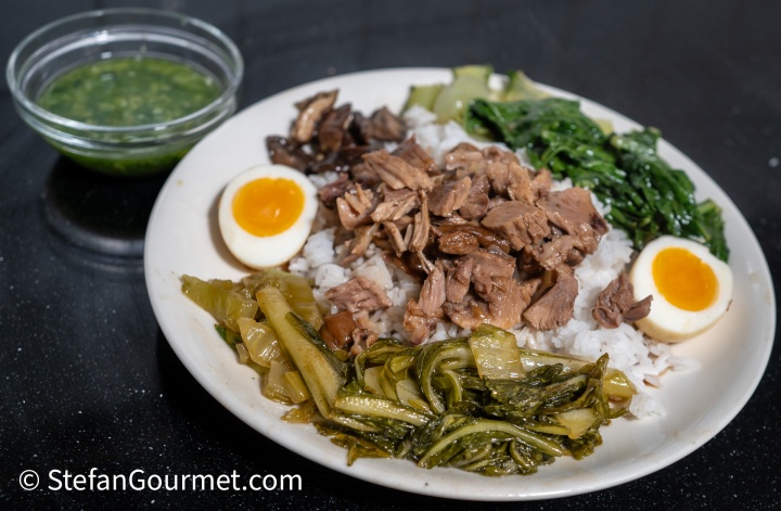 Serve the meat, skin, mustard greens, bok choy, and egg with the rice on preheated plates, and serve the sauce on the side.