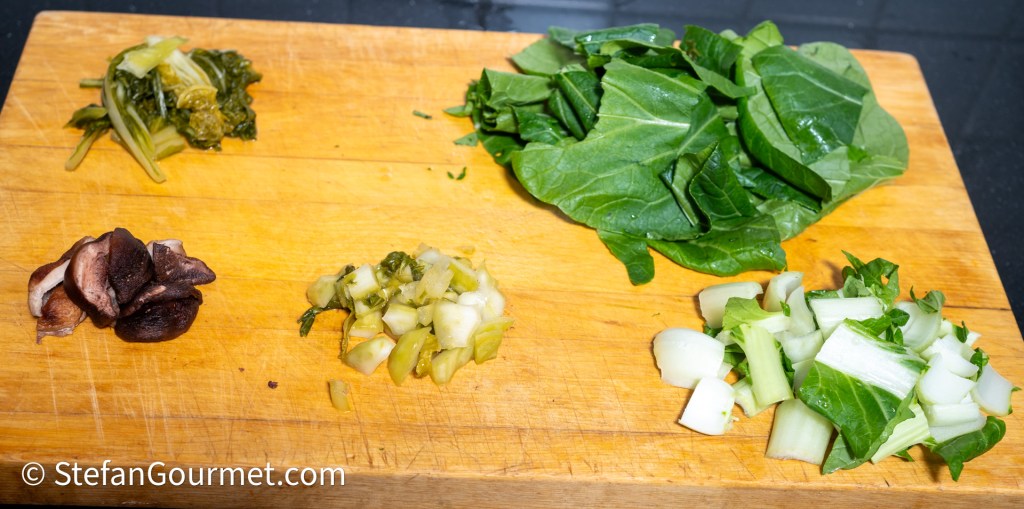 - 400 grams (.9 lbs) drained and pickled mustard greens, homemade or store-bought