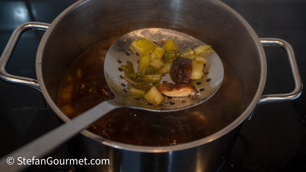 Reserve the skin and shii take mushrooms, and discard the remaining solids.