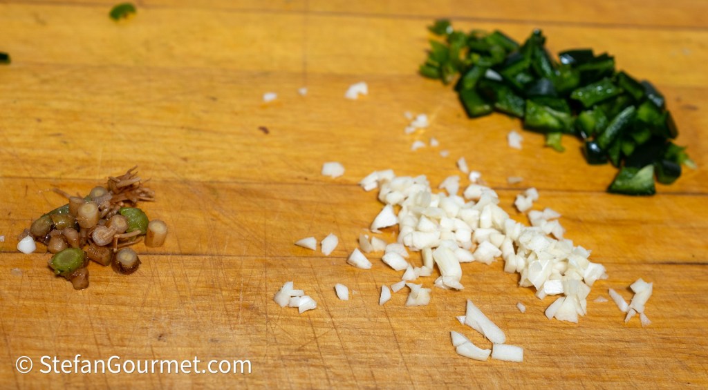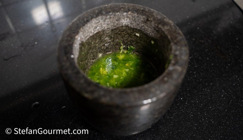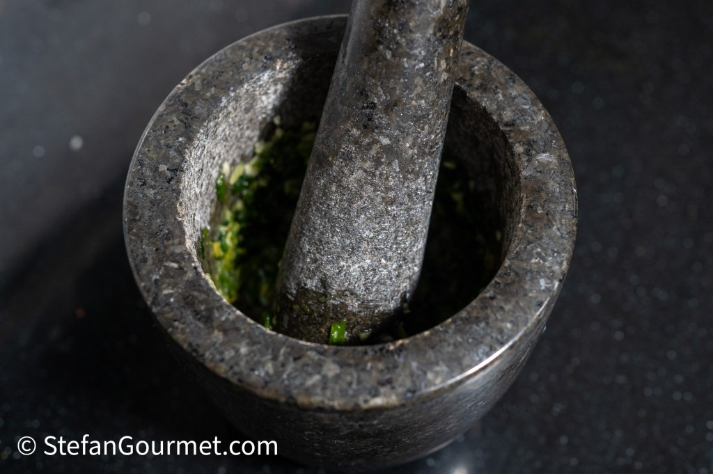 To make the sauce, chop 2 coriander roots, 2 garlic cloves, and 1 chillies.