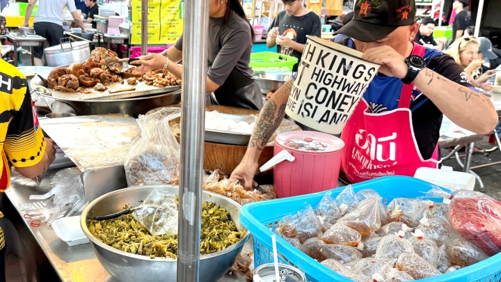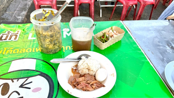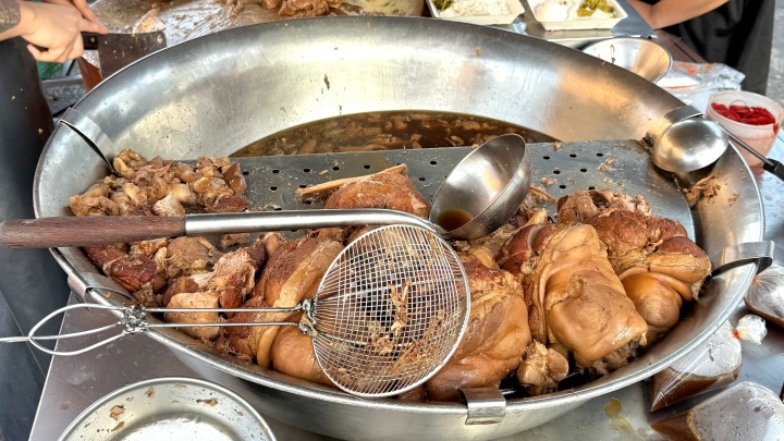 The very first dish we had when we arrived in Thailand was Khao Kha Mu. We got it in Chiang Mai near the north gate of the old city at a stand that is famous for a lady with a cowboy hat, although she wasn’t there when we were. The place seemed to be popular with both tourists and locals, although the locals were all getting takeout. There were two guided food stall tours when we were there. It was tender braised pork leg in a sweet soy-flavored gravy, served with rice and a hard-boiled egg, pickled mustard greens, and a spicy vinegar sauce on the side.