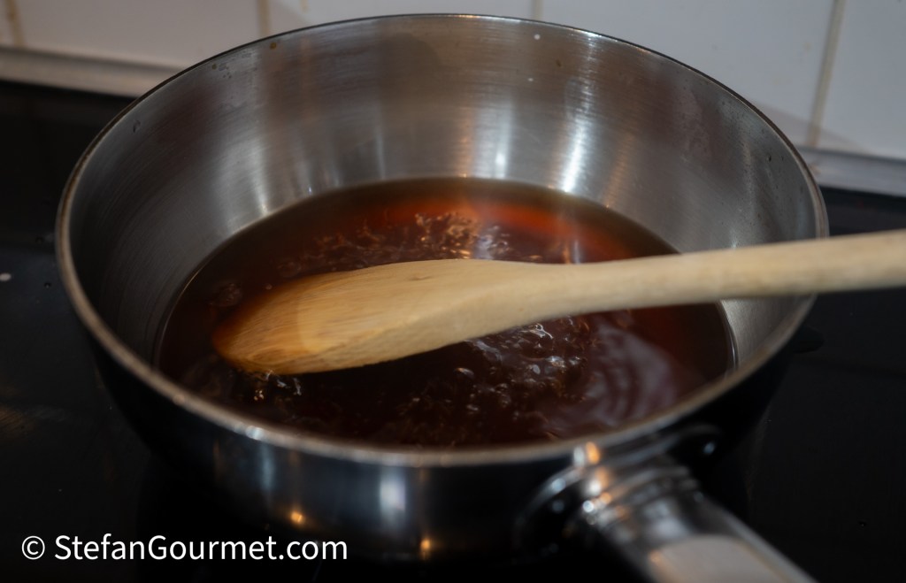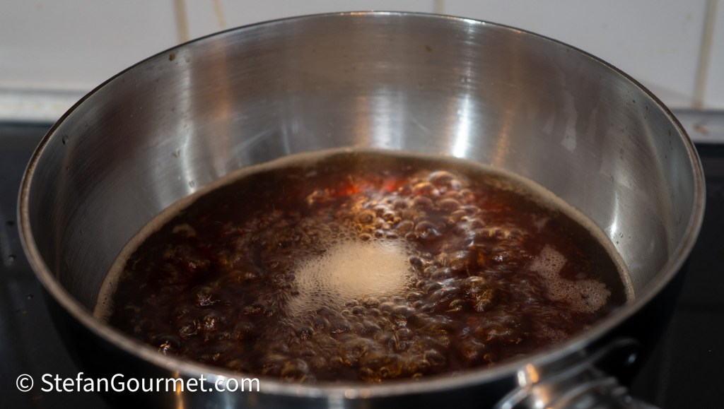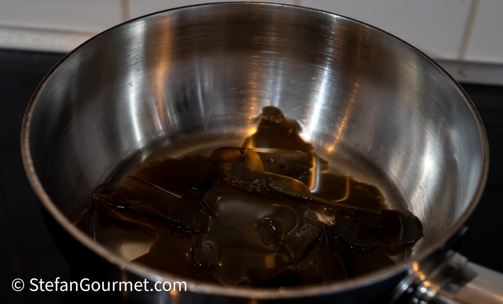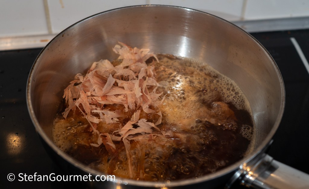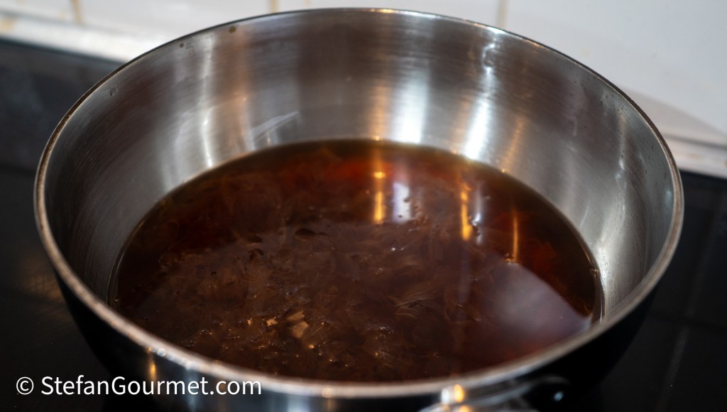 Return the konbu-infused water to the saucepan, and add 120 ml rice vinegar, 2 Tbsp soy sauce, and 1 1/2 Tbsp mirin. Bring to a boil, and allow to simmer briefly. (If using mirin with alcohol, you can put it in the pan first and bring it to a boil to burn off the alcohol. I use mirin for cooking, which does not contain alcohol.)