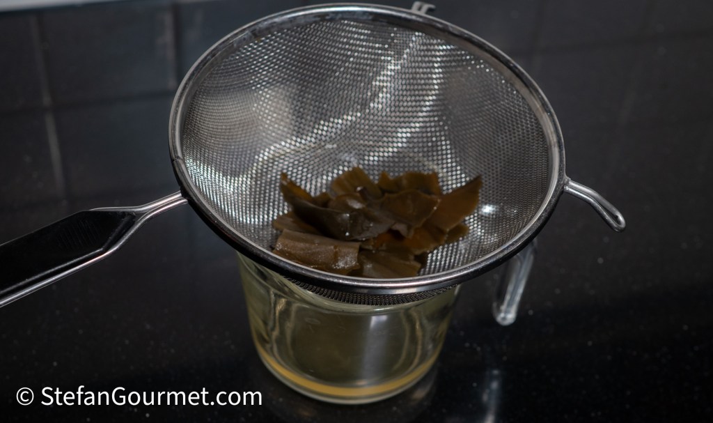 In the meantime, prepare the tosazu dressing. Place 120 ml of water and 5 grams of konbu in a saucepan. Bring almost to a boil, then turn off the heat and allow the konbu to steep in the cooling water.