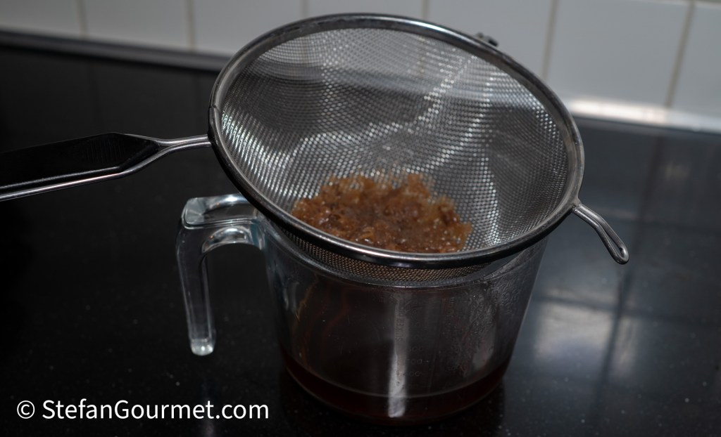 Stir 1/2 tablespoon of arrowroot with 1 tablespoon of cold water until smooth. Return the filtered liquid to the saucepan, and add the arrowroot slurry.