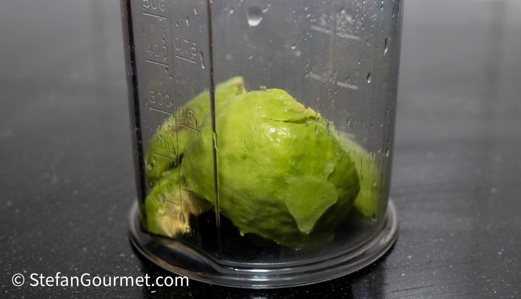 Remove the skin and seed from the avocados, and place in the bowl of a blender, together with 1 tablespoon of freshly squeezed lime juice, and 1/4 teaspoon table salt.