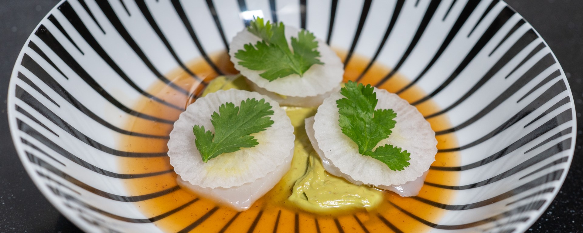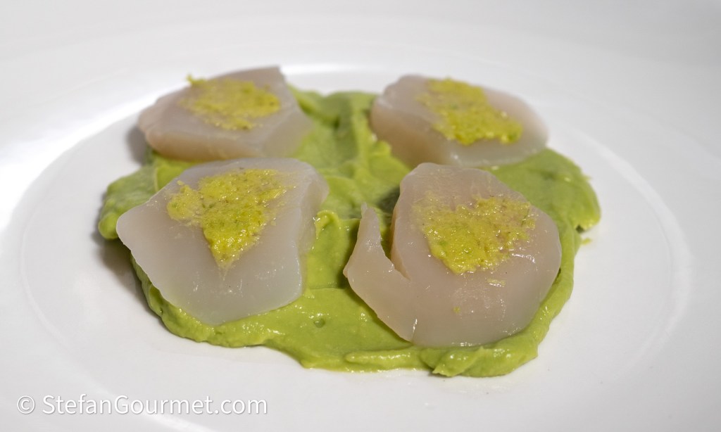 Place some avocado cream on each plate. Arrange the scallops on top, and spread a bit of wasabi paste on each scallop.