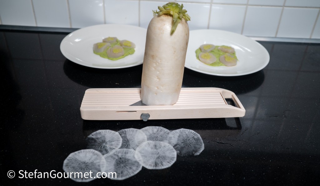Use a mandoline to slice the daikon very thinly, 3 slices per serving. For a pretty presentation, use a cookie cutter to give the slices a uniform shape. To crisp up the daikon, place the slices in a bowl of cold water for some time. (Then you should slice the daikon earlier.)