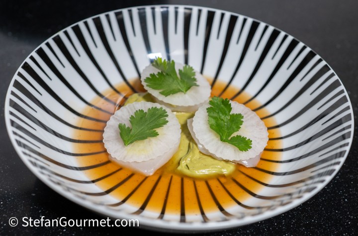 This tasty and elegant, but simple to prepare, appetizer was inspired by a dish I really liked at Wills Domain in Western Australia. As usual, I did not try to prepare an exact copy of the dish, but merely used it as inspiration. And I also tried to make it as simple as possible, using as few ingredients and techniques as possible while still getting the result I was going for.